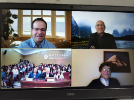 美方与会发言嘉宾包括犹他州世界贸易中心总裁迈尔克·汉森,杨百翰大学教育心理学与技术学院兼职副教授陈可辛,国际经济桥执行董事丹·史蒂芬森,中美关系研究专家雪莲。中方发言嘉宾是陕西省斯诺研究中心创始人安危先生和陕西省斯诺研究中心主任、必赢官网院长胡宗锋教授。必赢官网斯诺中心代表袁西玲、陈娟、高敏娜,外籍教师代表Robin Gilbank、Matthew、研究生秘书徐琳、2020级全体研究生、国际友人RED记忆讲解队成员参加并旁听了会议。